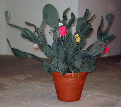 The work being produced and gradually displayed is primarily made from Border Patrol uniforms resulting in sculptures that represent desert plants that embody personal immigrant stories. The workers sharing in this labor and its rewards (Cabrera is sharing proceeds from sales with the craftsmen/women) are coming to this project from *The Houston Interfaith Worker Justice Center.